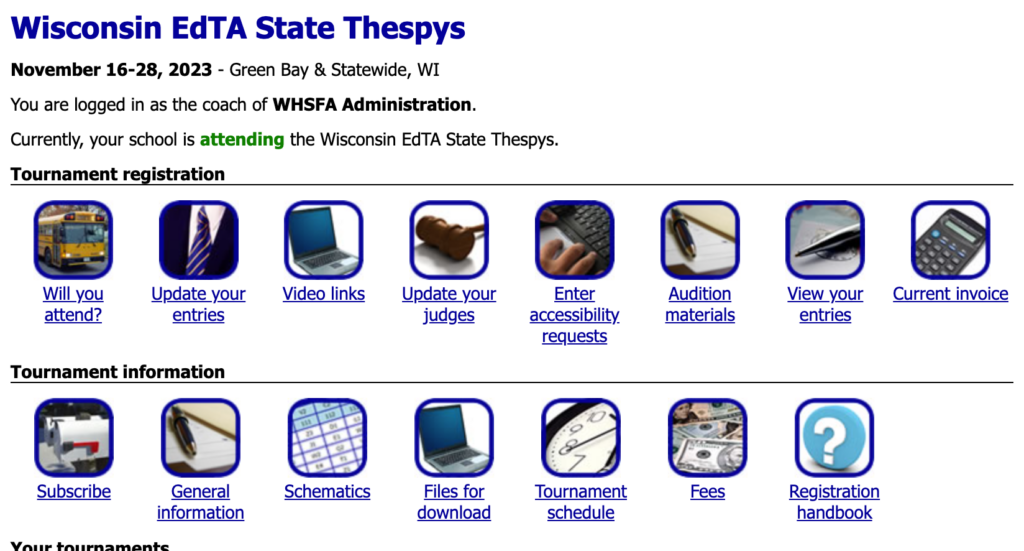 This is different from registration for one-act play. Go to the State Festival registration page and click the button, [State Thespys Registration]. Alternatively, the Your account screen in SpeechWire might have an icon for State Thespys.
