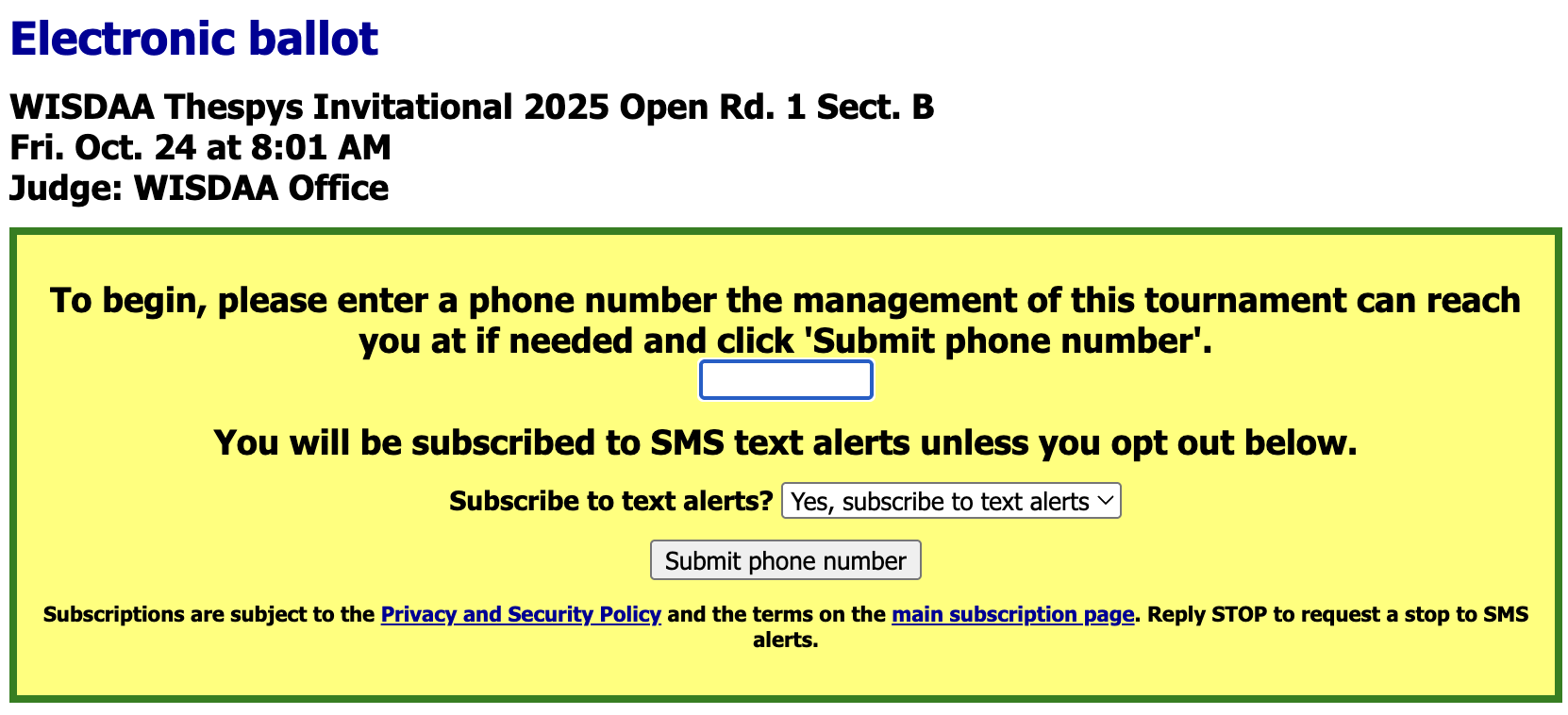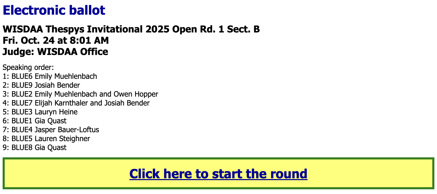 After you click the button to submit your phone number, or when you access the assignment screen (“Electronic ballot”) the first time, you will see listing of contestants and yellow highlighted link, Click here to start the round. This lets contest management know you are acknowledging the assignment.