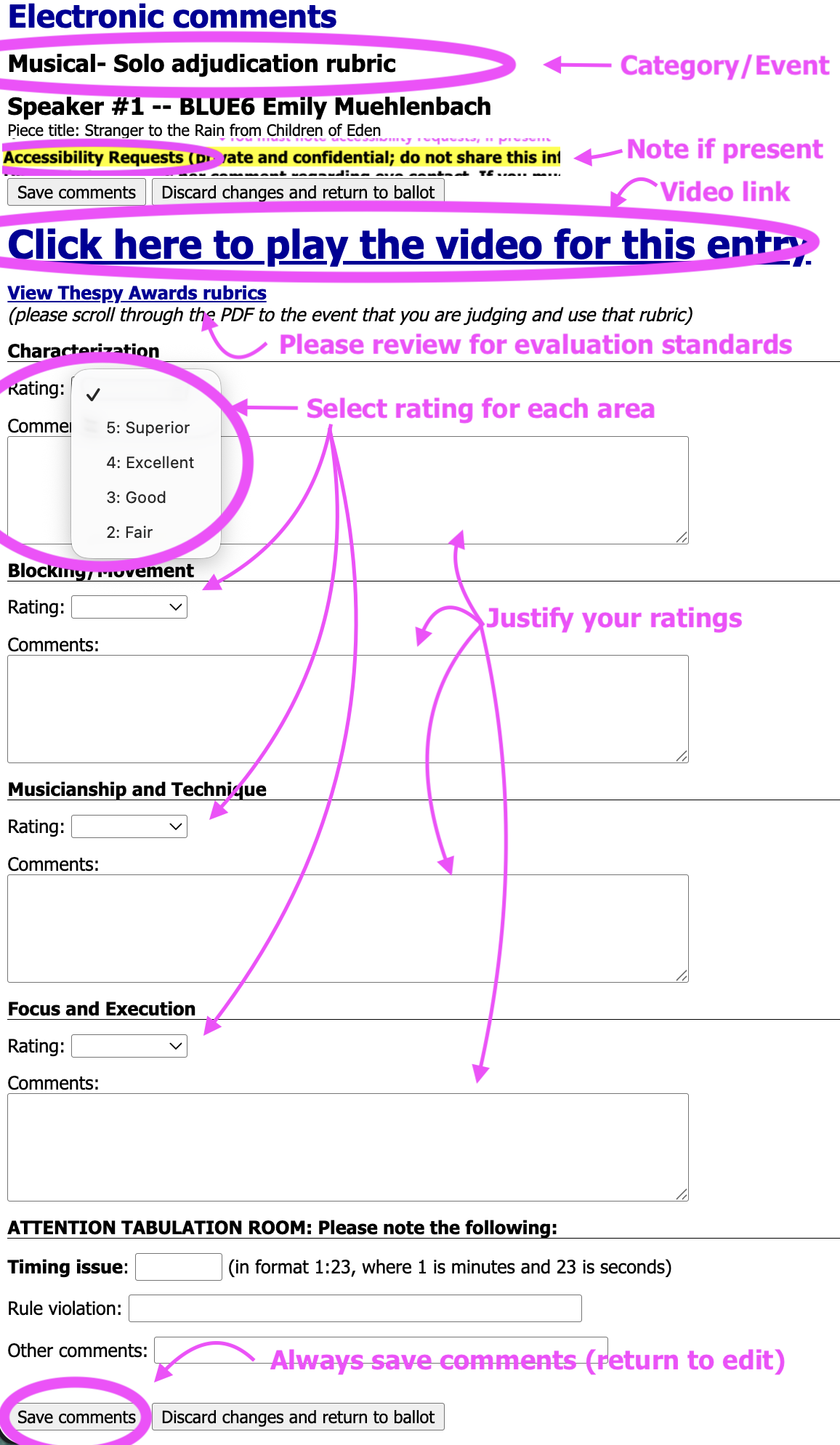 - Give constructive criticism from which to grow. Whenever you rate less than 5, describe how contestants did not meet expectations, using language above and giving specific examples of what the student did or said. When deducting more than one point, describe several items for improvement, or explain magnitude of a single issue. If something applies under multiple evaluation items (e.g., failure to project loudly impacted both audibility as well as emotional intensity called for), explain how your concern specifically relates to each area.
