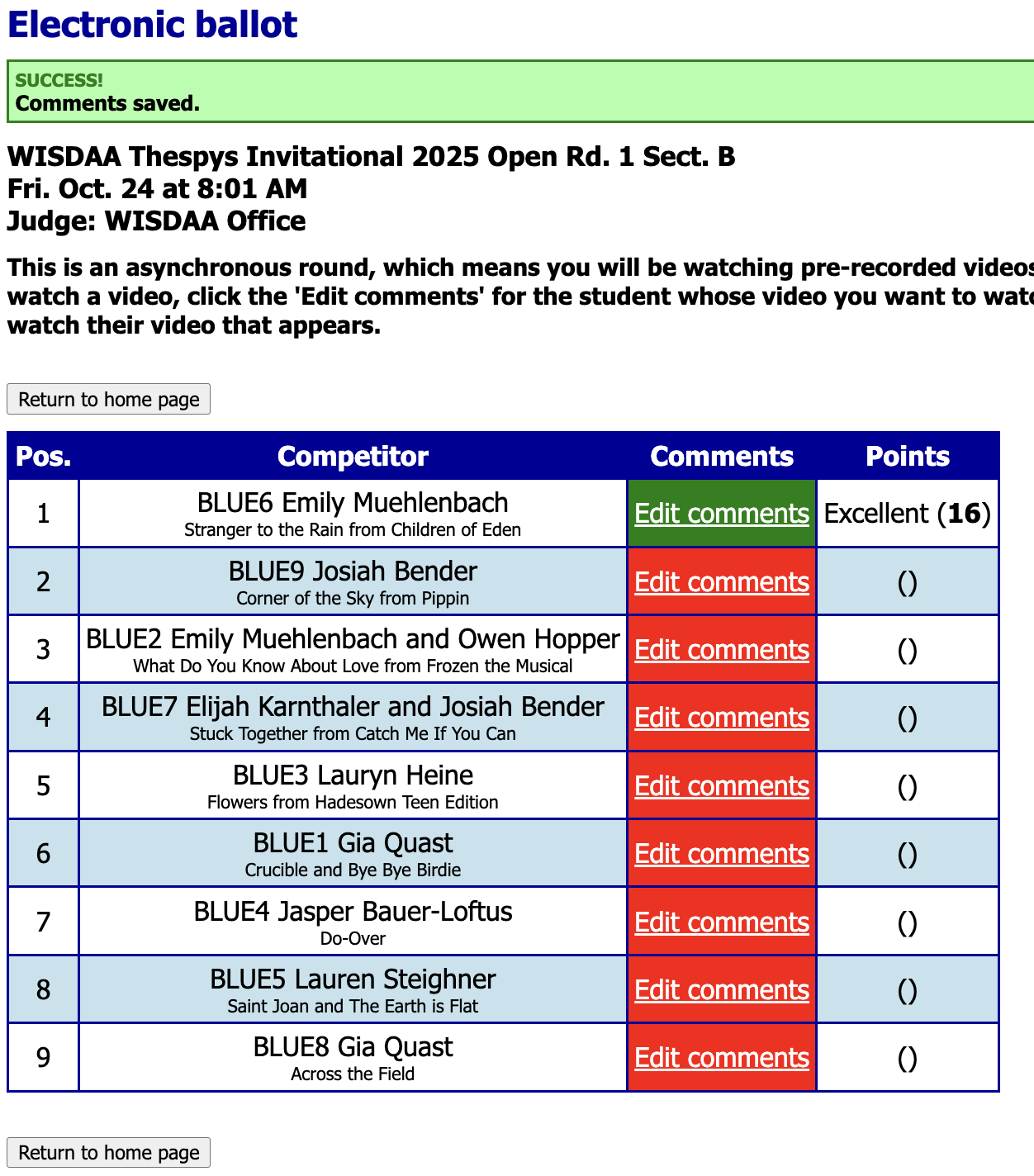 After you click [Save comments], the system returns you to the ballot page with contestants listed for that assignment, with the box now green to indicate it is complete. However, you can click “Edit comments” to return and change any rating or comments and click save.