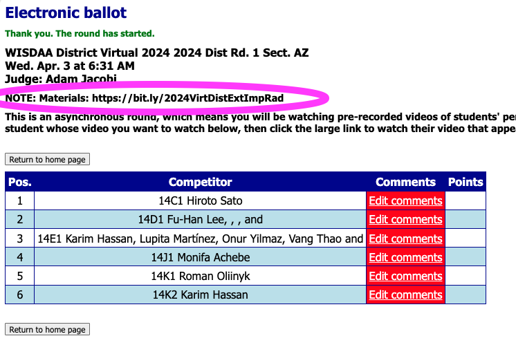 You will then see a table with alternating rows, with links to Edit comments for each contestant. Please see any notes at the top (annotated in this image in magenta). Materials could include Radio packet, Extemp questions or Impromptu prompts.
